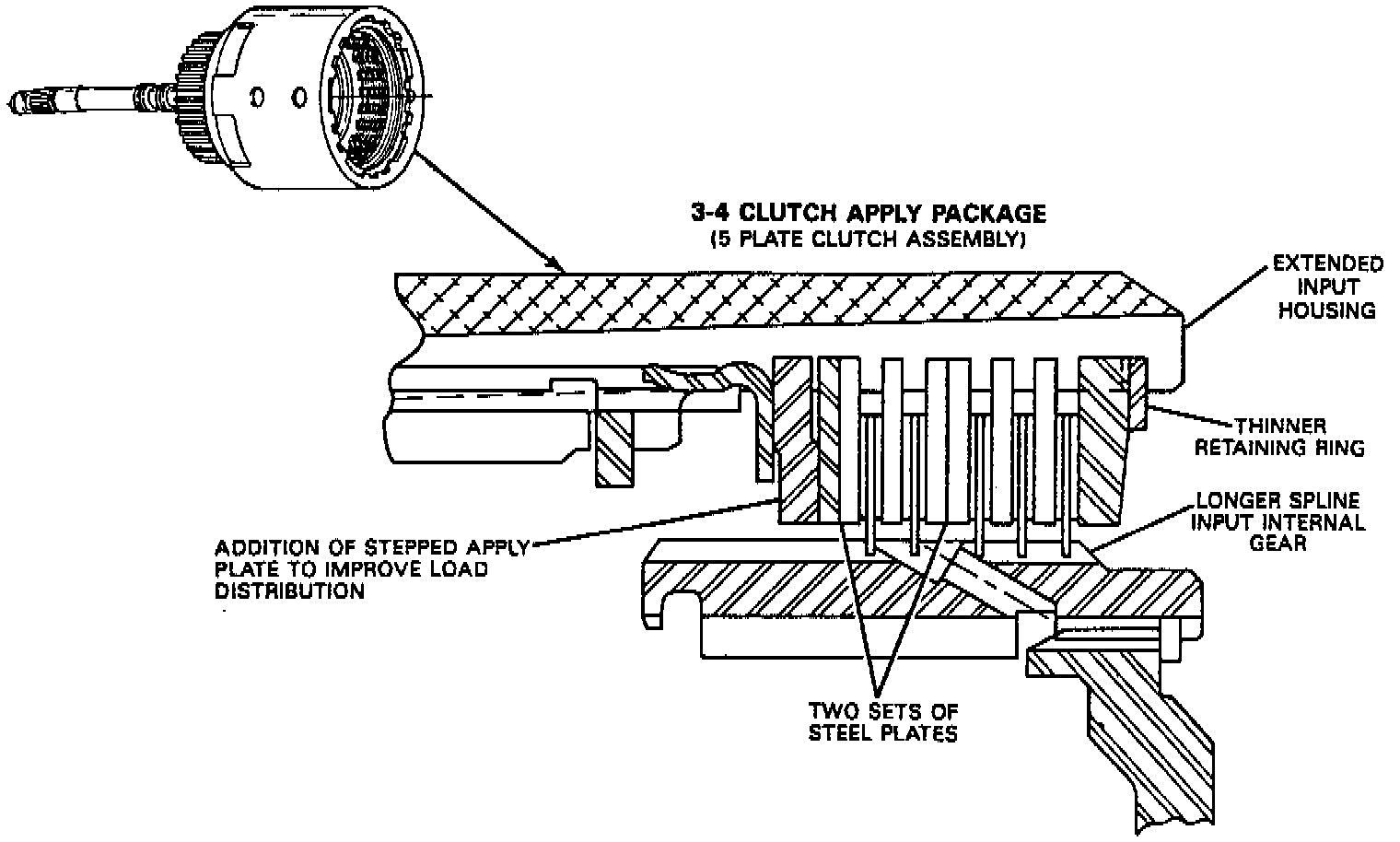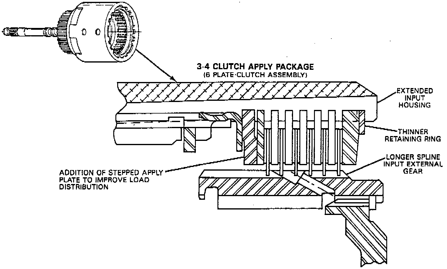 A new 3-4 clutch apply package is now in production starting February 9, 1987. A new 3-4 clutch apply plate (stepped) replaces a flat apply plate, Figs. 53 and 54. The input housing and shaft assembly is revised with longer housing splines for using the new 3-4 clutch apply plate. A new input internal gear with longer splines on the outside diameter is used. This package also eliminates usage of the longer 3-4 clutch apply ring (now using only the short 3-4 clutch apply ring on all models). New 3-4 backing plates are used as reflected in the "Backing Plate Selection" charts shown. A new internal retaining ring (thinner) and end configuration is changed for identification. The changes described here only apply to transmissions built after February 9, 1987 (Julian date 040).