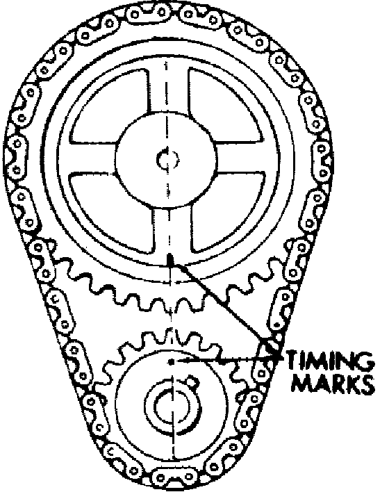 3. Install fuel pump eccentric with flat side rearward, Fig. 14. Then install oil slinger and replace front cover. The valve timing marks, Figs. 13 and 14, do not indicate TDC compression stroke for No. 1 cylinder, which is used for distributor installation. If distributor was removed, install timing chain and sprockets, aligning timing marks, Figs. 13 and 14, then rotate engine until No. 1 cylinder is on compression stroke and camshaft timing mark is 180° from valve timing position shown in illustrations, then install distributor.