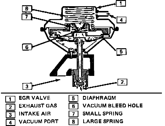 When the air valve receives sufficient exhaust backpressure through the hollow shaft it closes the bleed. At this point, maximum available vacuum is applied to the diaphragm and the EGR valve opens. If there is little or no vacuum in the vacuum chamber such as at idle or wide open throttle, or if there is little or no pressure in the exhaust manifold, the EGR will not open. This valve will not open if vacuum is applied to it with the engine stopped or idling.