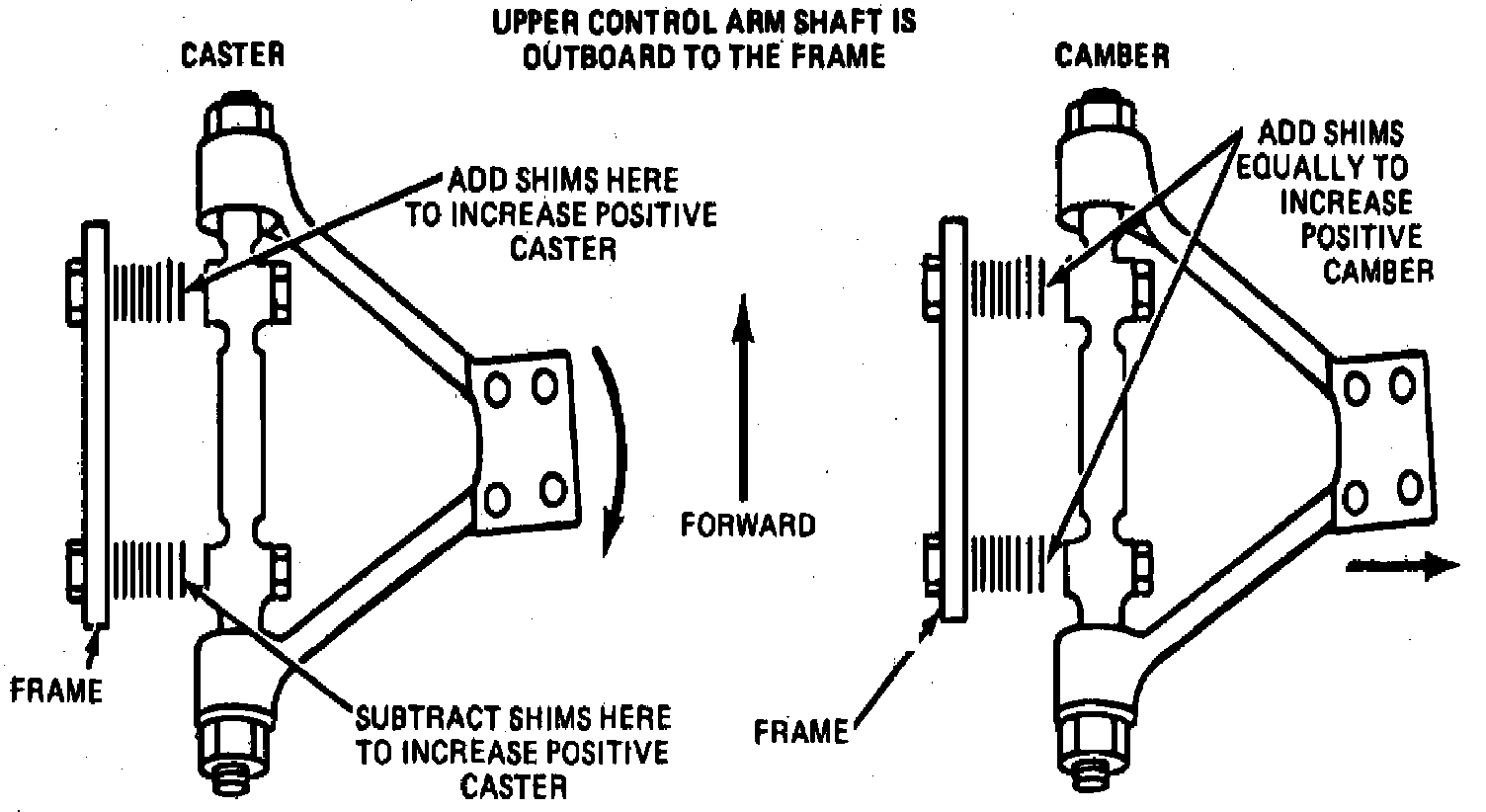 Camber adjustments are made by means of shims between the upper control arm inner support shaft and the support bracket attached to the frame. Shims may be added, subtracted or transferred to change the readings.