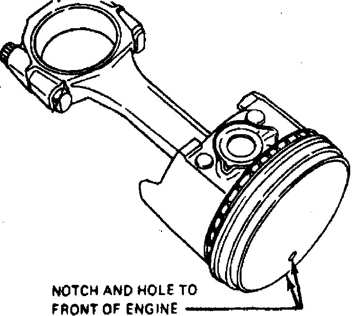 Install piston to rod with notch or arrow and hole on piston facing toward front of engine and rod bearing tang slot opposite camshaft, Figs. 16 and 17 Upon installation, measure the connecting rod side clearance using a suitable feeler gauge. Measurement taken should be as follows: