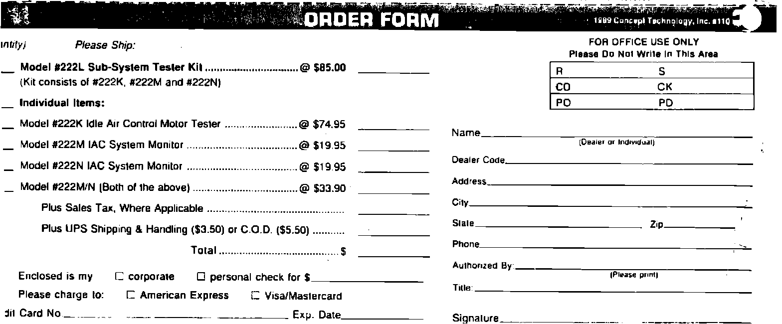 The use of the tester kit and improved diagnostics represent a superior IAC testing procedure that will result in a high degree of user confidence. The tester positively concludes that the IAC system is either fully functional or faulty and if faulty whether it is the valve or the circuits. The tester kits can be ordered from Concept Technology, Inc. or Kent-Moore, Inc. Order forms are included with this bulletin.
