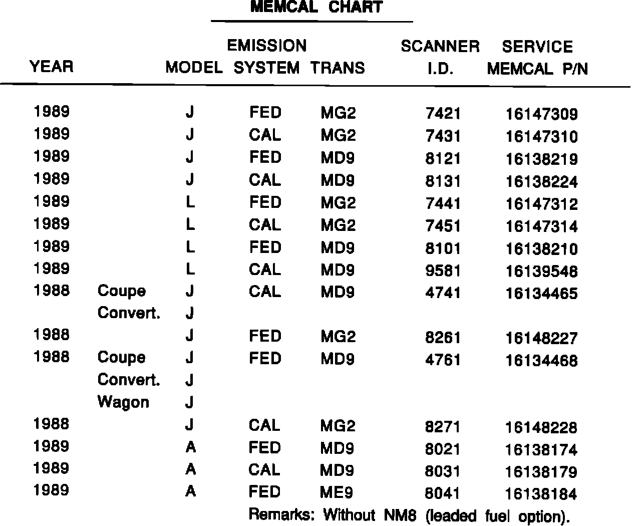 THIS BULLETIN CANCELS AND SUPERSEDES DEALER SERVICE BULLETIN NO. 89-88-6E, DATED MARCH 1989. IT HAS BEEN REVISED TO CLARIFY THE MODEL USAGE IN THE MEMCAL CHART AND TO CHANGE THE PARTS STATEMENT. PLEASE DISCARD ALL COPIES OF 89-88-6E.