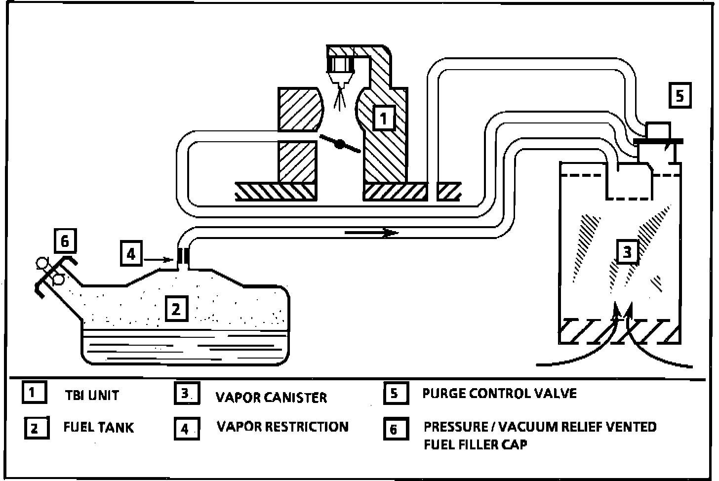 The purge valve is an integral part of the canister. When the engine is running, manifold vacuum is supplied to the top tube of the purge valve (control vacuum signal) which lifts the valve diaphragm and opens the valve. The lower tube on the purge valve is connected to a port above the TBI throttle valve. The rate of purge through this port is controlled by throttle position.