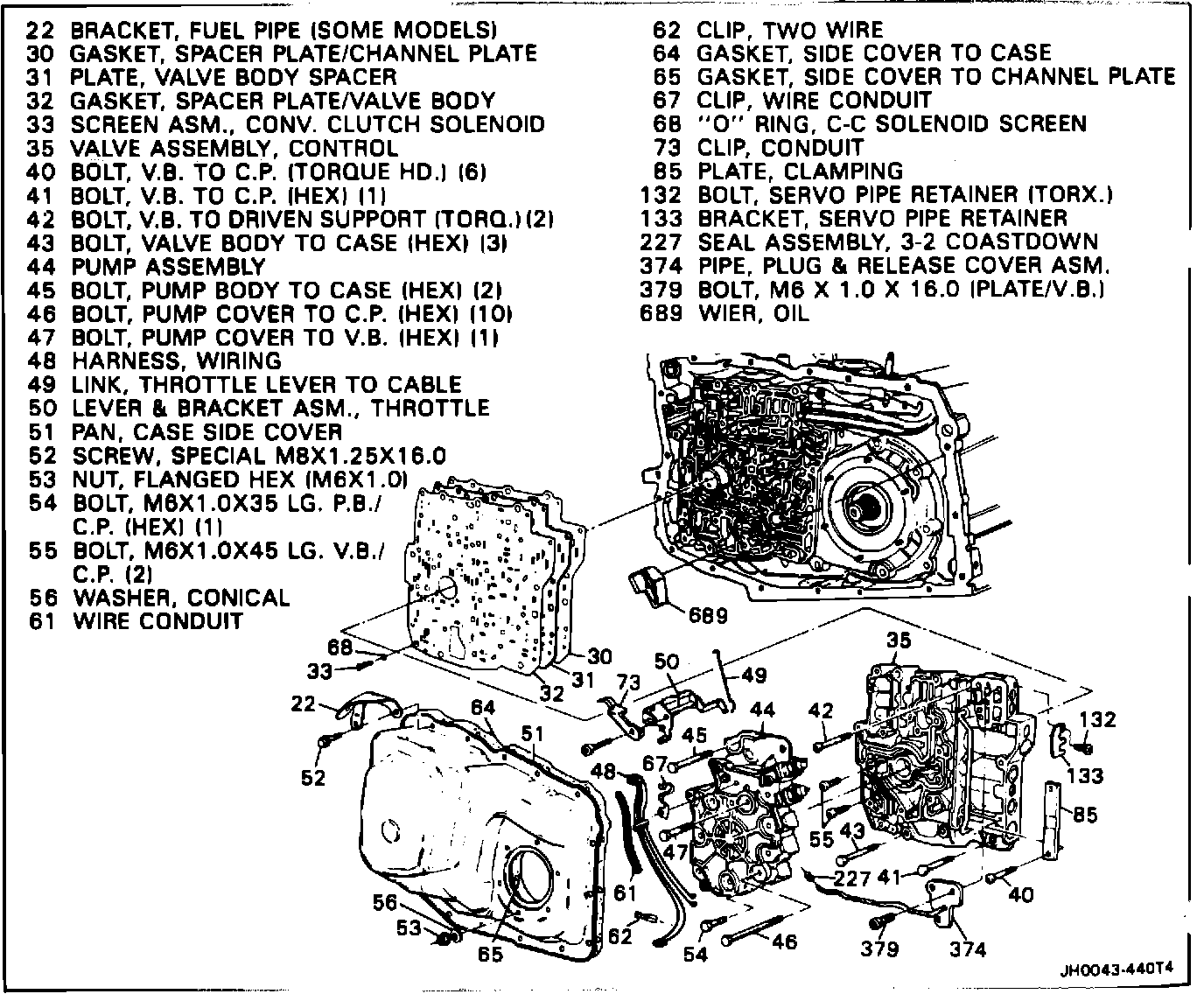 As of October 8, 1987, (Julian Date 281) the valve body clamping plate, Item Number 85 in Illustration, was eliminated from production of all 440-T4 transaxles. Studies indicated this part was not required for proper clamp load on the control valve assembly, spacer plate, and gaskets.