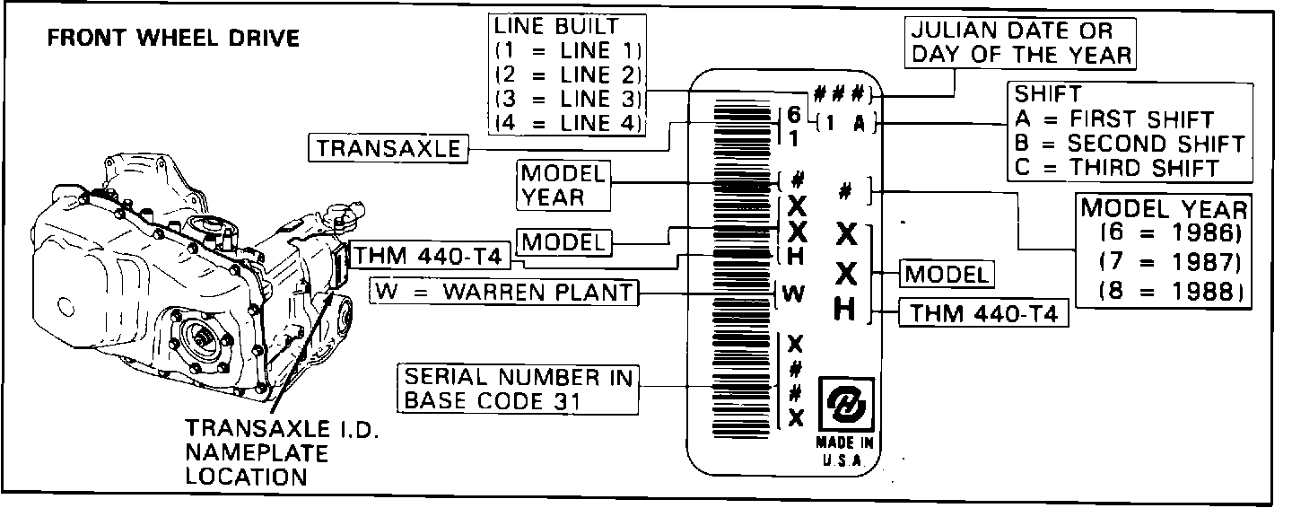 FIGURE 1 - THM 440-T4 TRANSAXLE IDENTIFICATION INFORMATION: