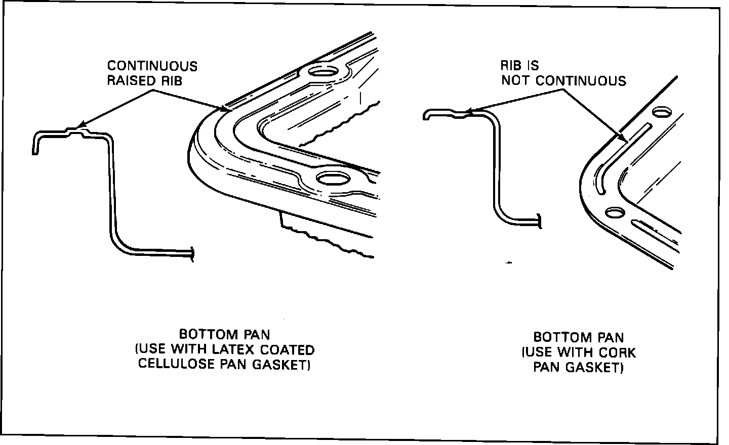 A new transaxle bottom pan and latex coated cellulose gasket entered production on THM 440-T4 transaxles January 5, 1988 (Julian Date 005). The new bottom pan has a continuous raised rib on the pan rail and when used with the latex coated gasket, will result in better sealing and reduction of crushing/splitting out the gasket when the pan bolts are torqued.