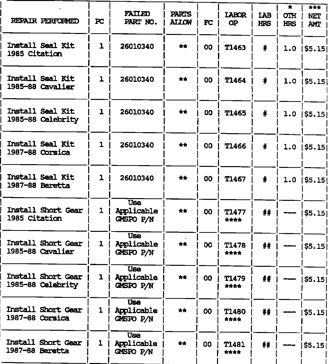 * The 1.0 Hrs. in the "Other Hours" column for labor operations T1463, T1464, T1465, T1466 and T1467 represents the time required for seal kit installation.