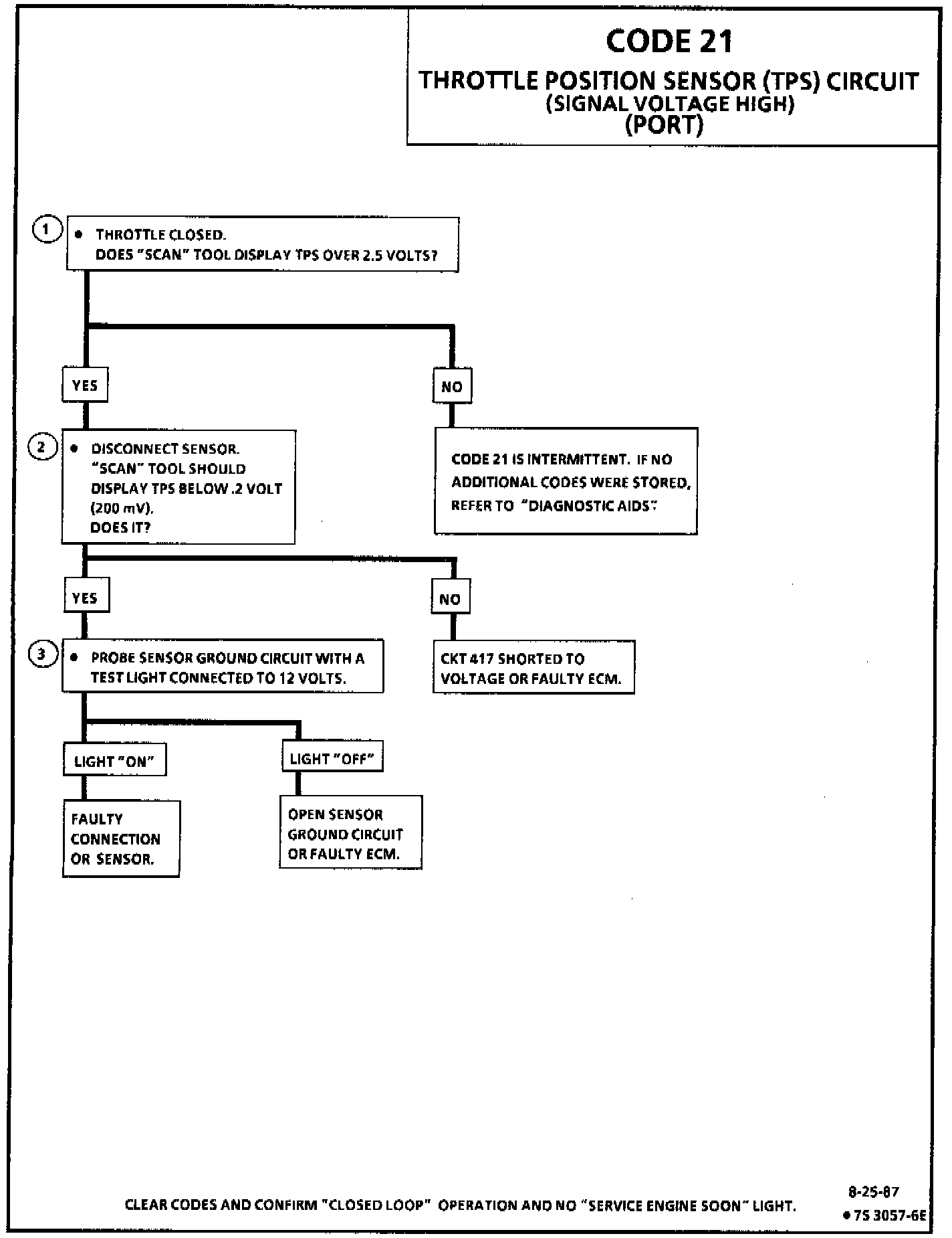 A "Scan" tool reads throttle position in volts. Voltage should increase at a steady rate as throttle is moved toward wide open throttle. Also, some "Scan" tools will read throttle angle 0% = closed throttle, 100% = wide open throttle. An open in CKT 452 will result in a Code 21. Refer to Diagnosis by Symptom / Intermittents. - Intermittent Malfunctions