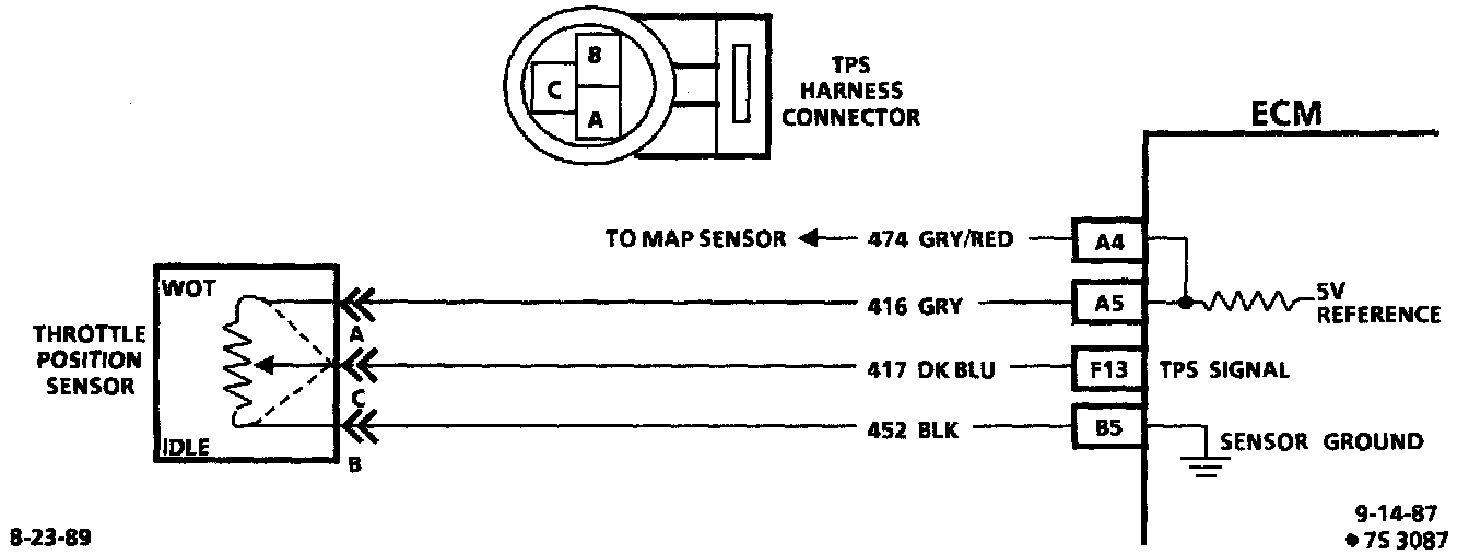 ^ TPS check: The TPS has an auto zeroing feature. If the voltage reading is within the range of 0.29 to 0.98 volt, the ECM will use that value as closed throttle. If the voltage reading is out of the auto zero range on an existing or replacement TPS, the TPS should be adjusted. Refer to Fuel Delivery and Air Induction / Throttle Position Sensor.
