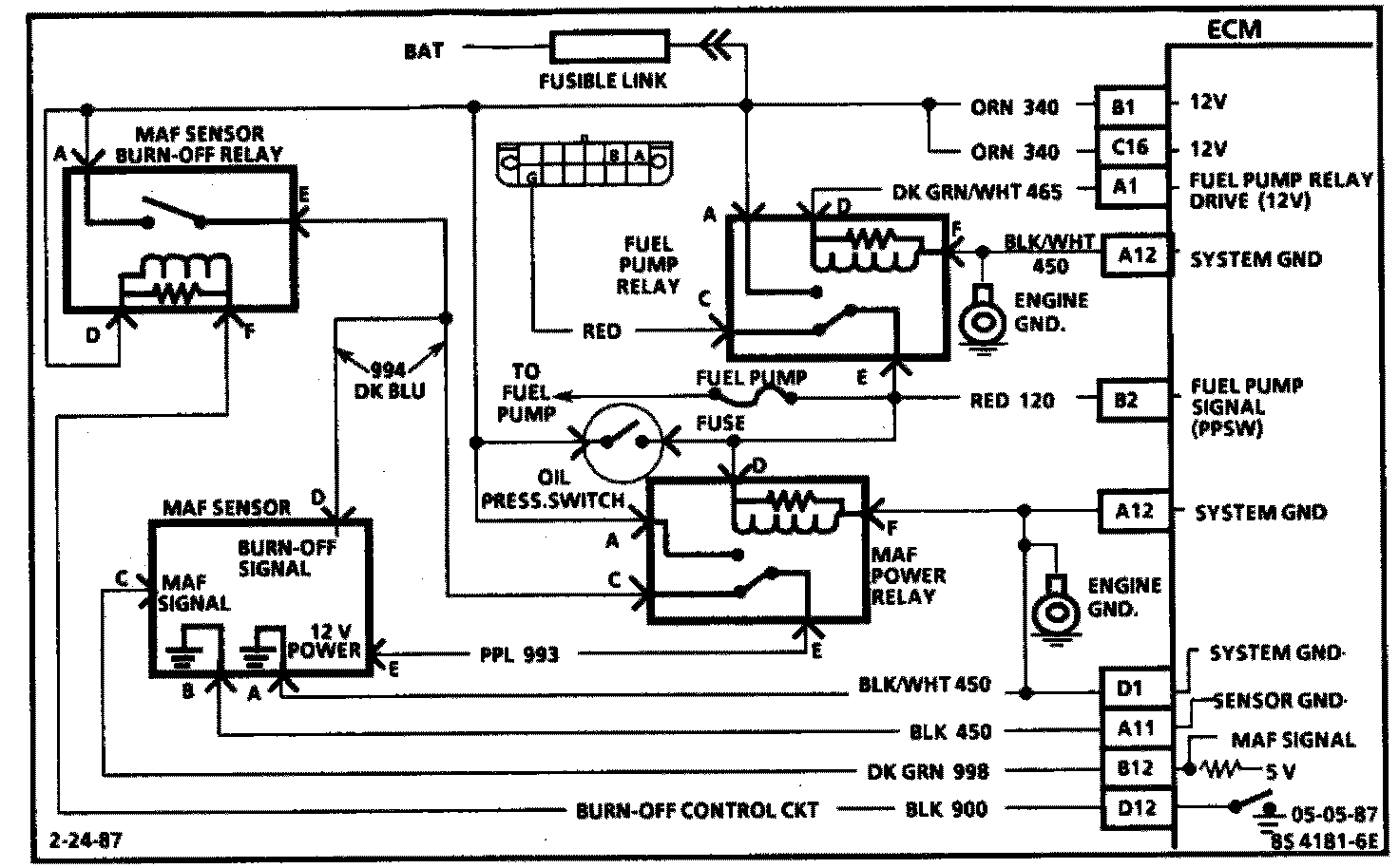 The oil pressure switch or the ECM, through control of the fuel pump relay, will provide 12 volts for the MAF power relay which provides the 12 volts needed by the MAF sensor.