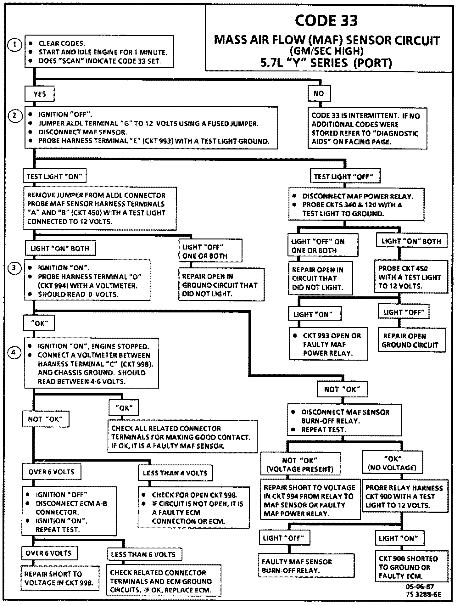Intermittent: By jumpering the fuel pump test terminal ("G" term. of ALDL) to 12 volts, the MAF sensor will stay powered up and the signal line should see a low voltage, less that 250 mV or displayed as low grams per second on a "SCAN" tool. By wiggling the related wiring the intermittent may be detected. Also, an erratic signal with the engine running may indicated faulty wiring or components. A burn-off signal to the MAF sensor, while running, may result in a code 33. Be sure relay connections are clean and check CKT 994 for a potential short to voltage.