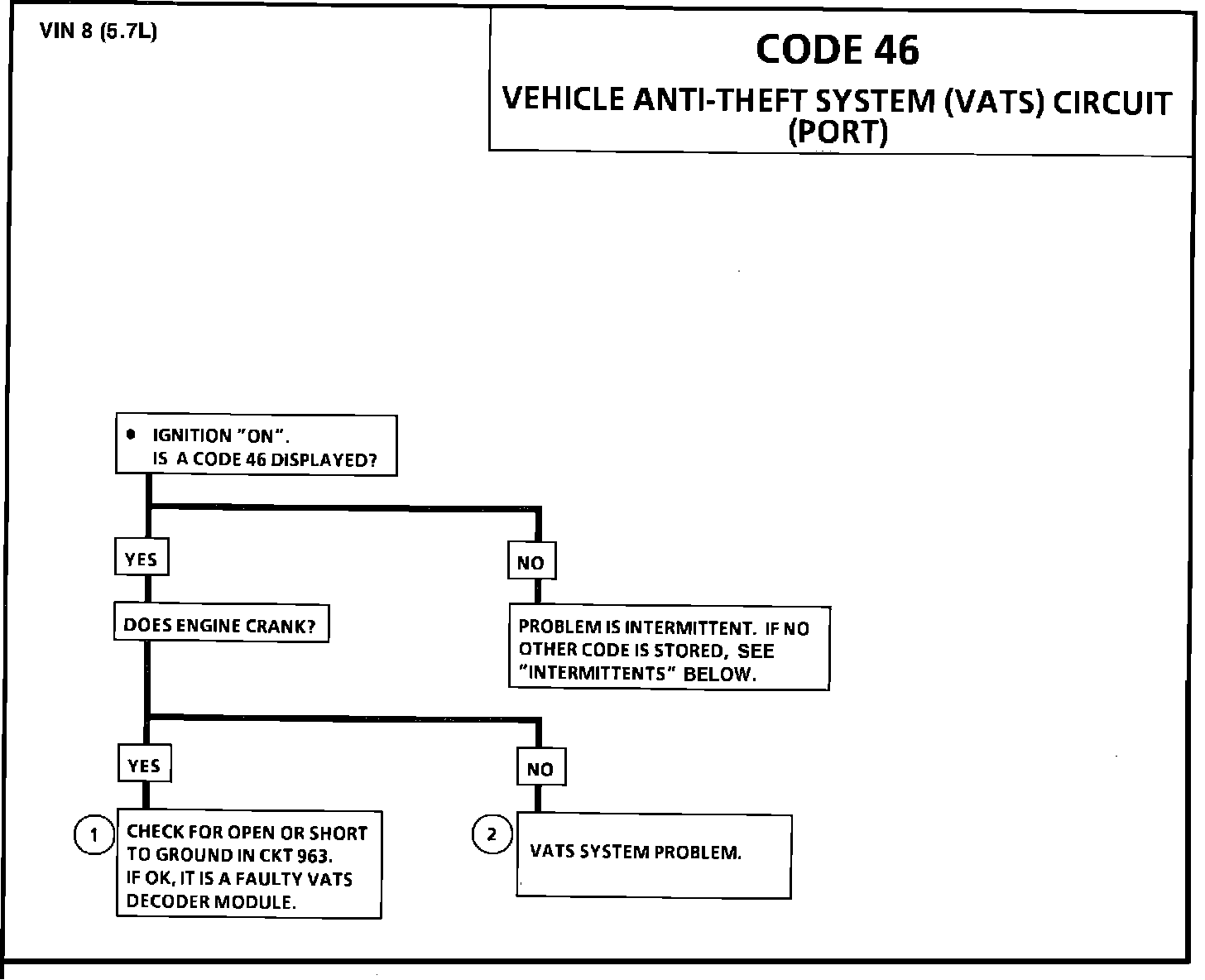 1. If the engine cranks, and a Code 46 is stored, it indicates that the portion of the module which generates the signal to the ECM is not operating or the 963 CKT is open or shorted to ground. The ECM may be faulty but a defective VATS decoder module is more likley.
