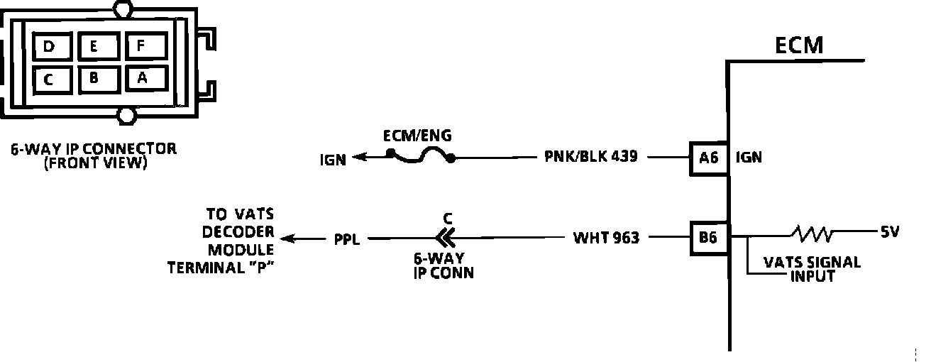 The Vehicle Anti-Theft System (VATS) is designed to disable vehicle operation if the incorrect key or starting procedure is used. The VATS decoder module sends a signal to the Electronic Control Module (ECM) if the correct key is being used. If the proper signal does not reach the ECM on CKT 963, the ECM will not pulse the injectors "ON" and thus not allow the vehicle to be started. Code 46 will set, if the proper signal is not being received at ECM terminal "B6", when the ignition is turned "ON."