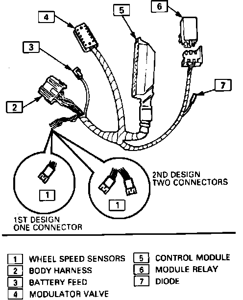 The wiring harness, Fig. 4, provides a path for wheel speed sensors, lateral acceleration switch, power and stop light switch information to control module and also outputs the current control to modulator valve and ANTILOCK warning lamp.