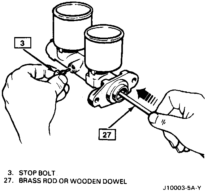 3. Fully depress the master cylinder pistons with a brass rod or wooden dowel (27) as shown in and remove stop bolt (3) Then remove snap ring (17) with retaining ring pliers.