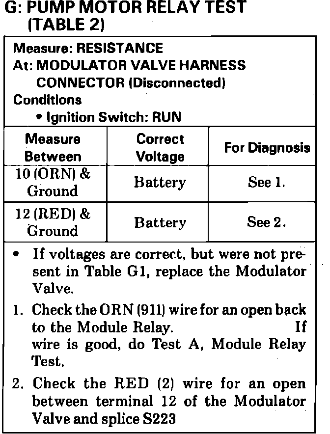 G: Pump Motor Relay Test (Table 2)