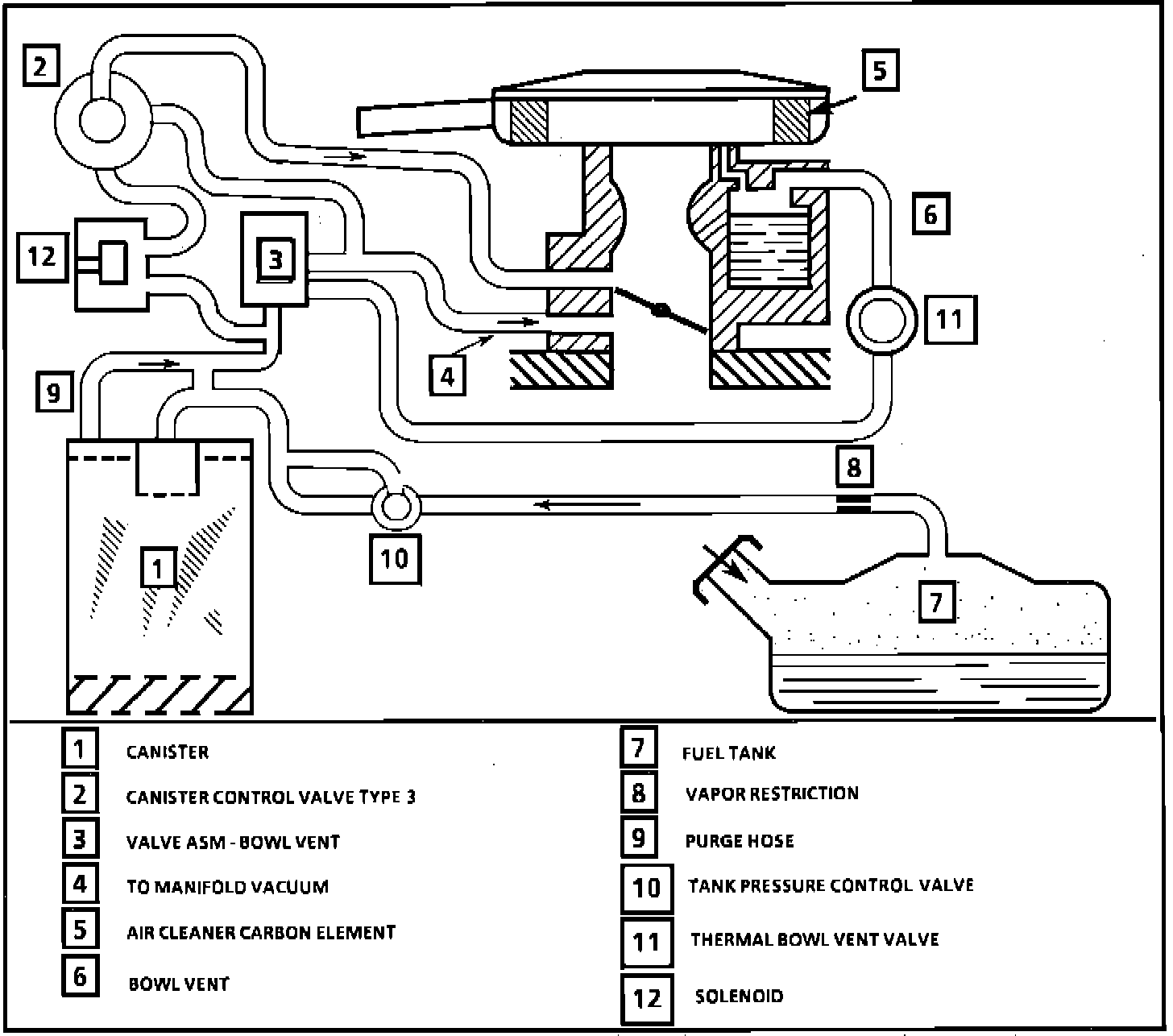 The bowl vent valve vents vapors from the carburetor bowl area to the canister when the engine is OFF. The bowl vent valve receives vacuum when the engine is running thus seating the valve preventing vapors from venting from the carb bowl. The vapors from the canister may still be purged.