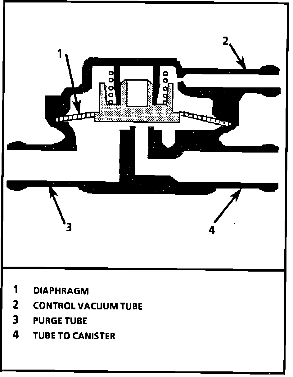 This valve is located in the canister purge line between the purge solenoid valve and the intake manifold and connected to ported vacuum. Vacuum opens the valve to allow purge. When the engine is OFF the canister control valve prevents vapors from the bowl vent valve from venting to the atmosphere.