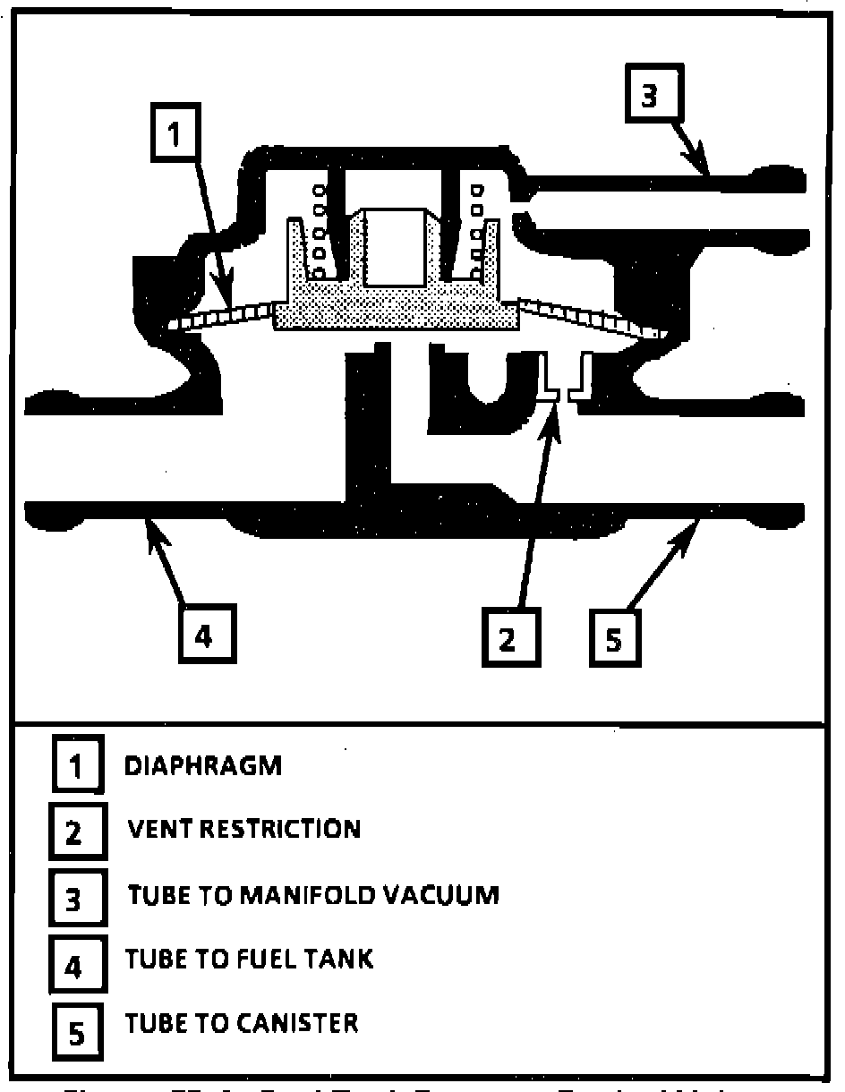 The fuel tank pressure control valve, located in the engine compartment, is a spring biased diaphragm valve, normally closed. When the vapor pressure in the fuel tank exceeds 6.0 kPa the valve will open allowing the vapors to vent to the canister and then be purged. When the tank pressure drops sufficiently the tank pressure control valve will close, thus keeping the vapors in the fuel tank. The control vacuum tube of the control valve is connected into the canister line to prevent contamination from entering the valve.