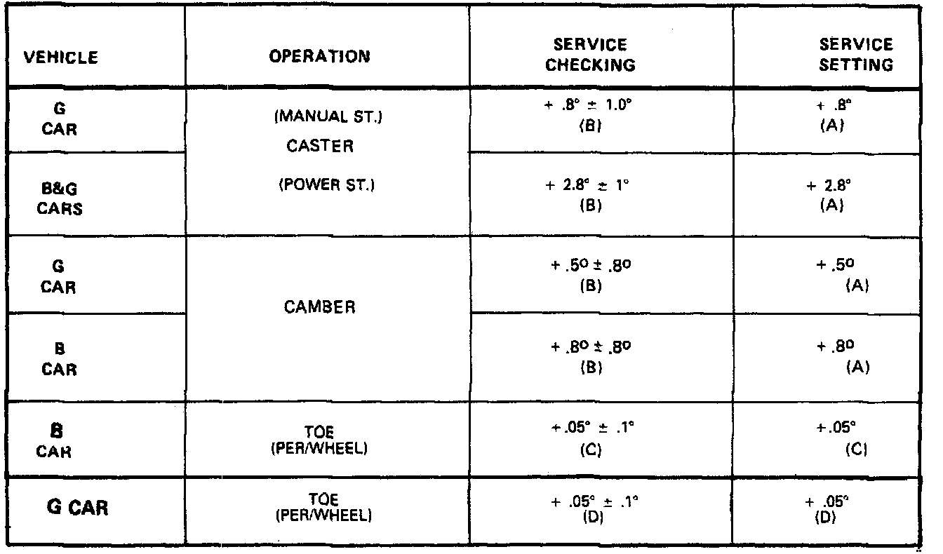 (D) TOE-IN-LEFT AND RIGHT SIDE TO BE SET SEPARATELY PER WHEEL AND STEERING WHEEL MUST BE HELD IN STRAIGHT AHEAD POSITION WITHIN ±2.5°.