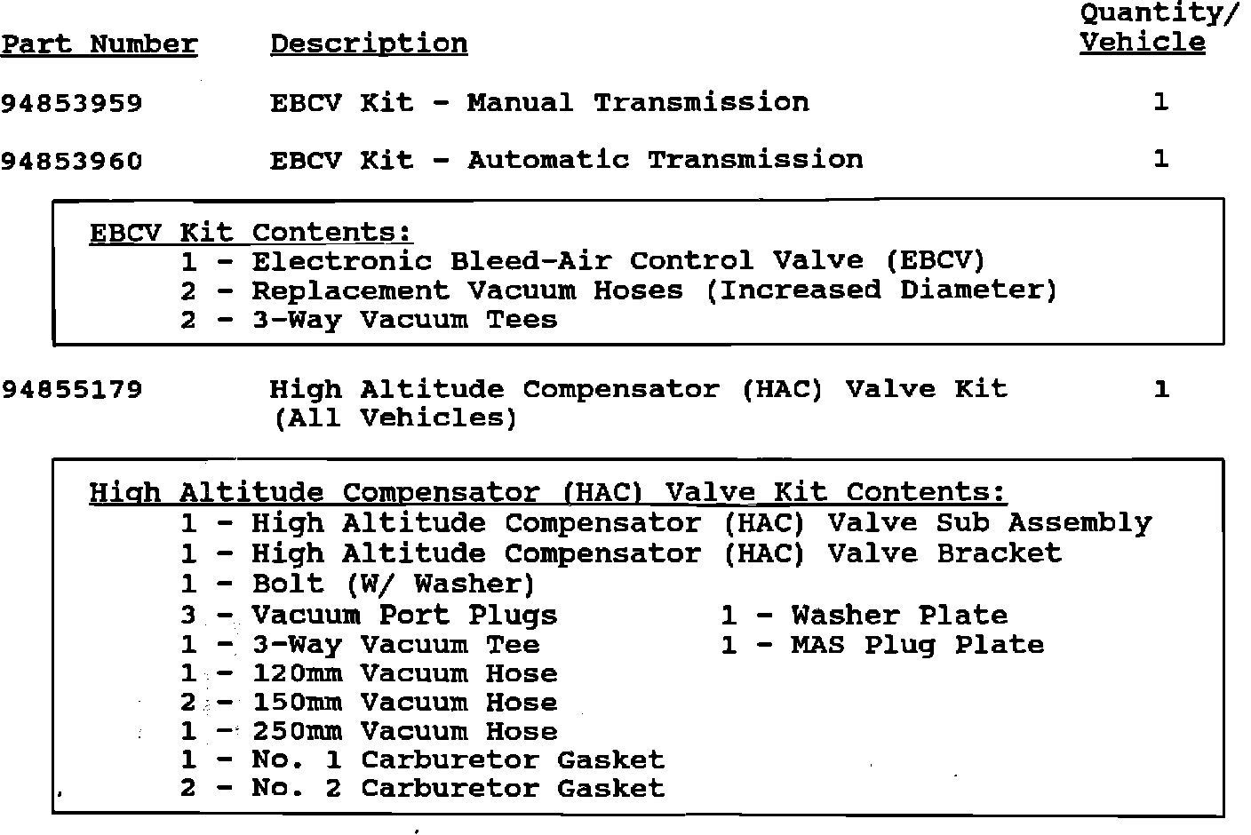 Dealers will be preshipped High Altitude Compensator (HAC) valve kits (with no delivery charge) equivalent to 35% of their involved vehicles beginning on December 6, 1993. EBCV kits will not be preshipped.Additional carts required to perform this campaign are to be obtained from General Motors Service Parts Operations (GMSPO). To ensure these parts will be obtained as soon as possible, they should be ordered from GMSPO on a "C.I.O." order with no special instruction code, but on an advise code (2).