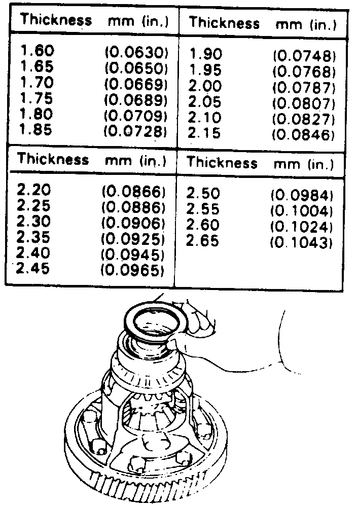 6. If preload is not as specified, remove differential from case and select a suitable shim from chart, see image, to bring preload within specifications. Each shim will change preload approximately 2.6 - 3.5 inch lbs.