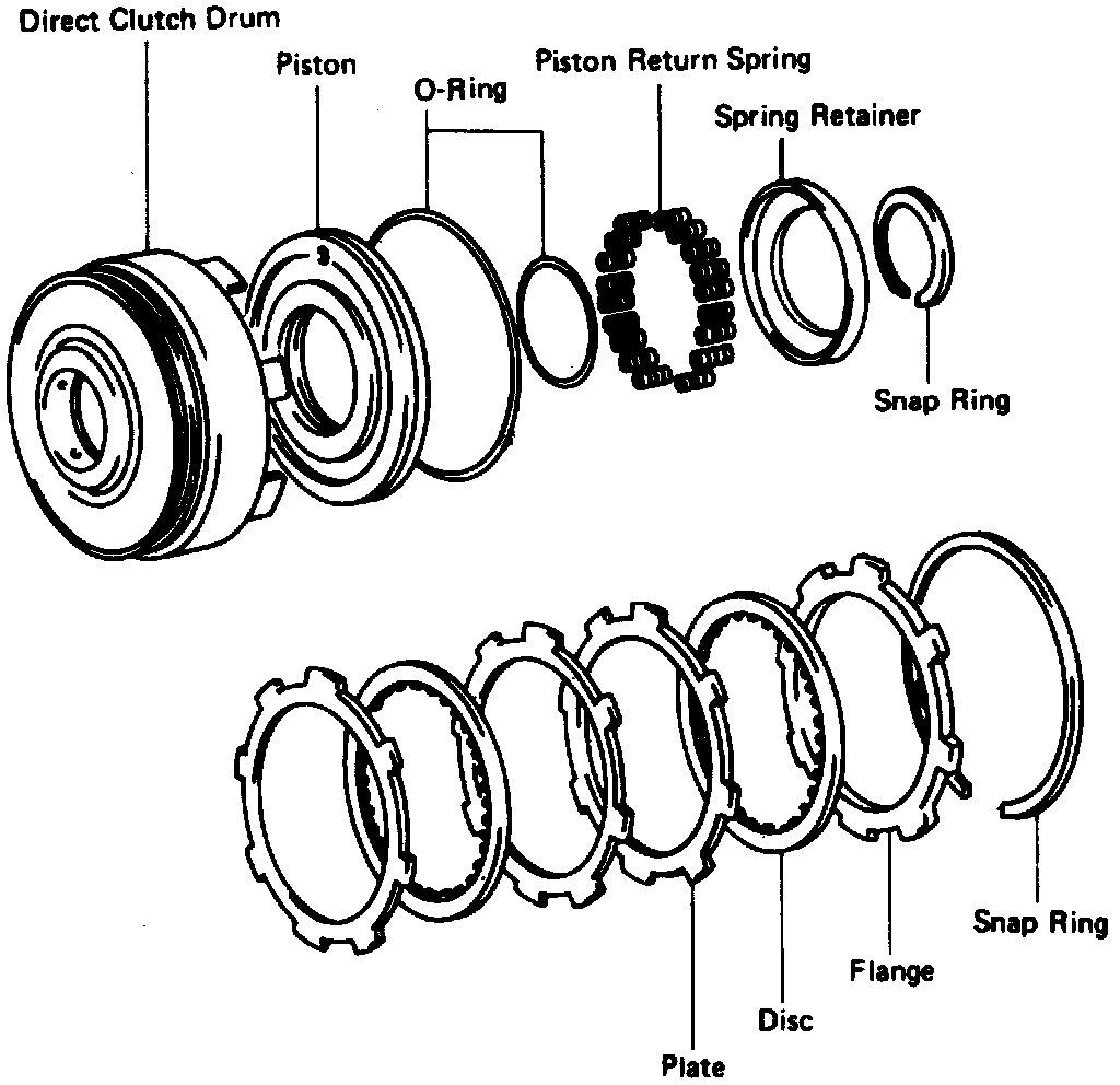 5. Assemble direct clutch onto oil pump, then remove piston using compressed air and, if necessary, a suitable pair of pliers. Remove direct clutch from oil pump.
