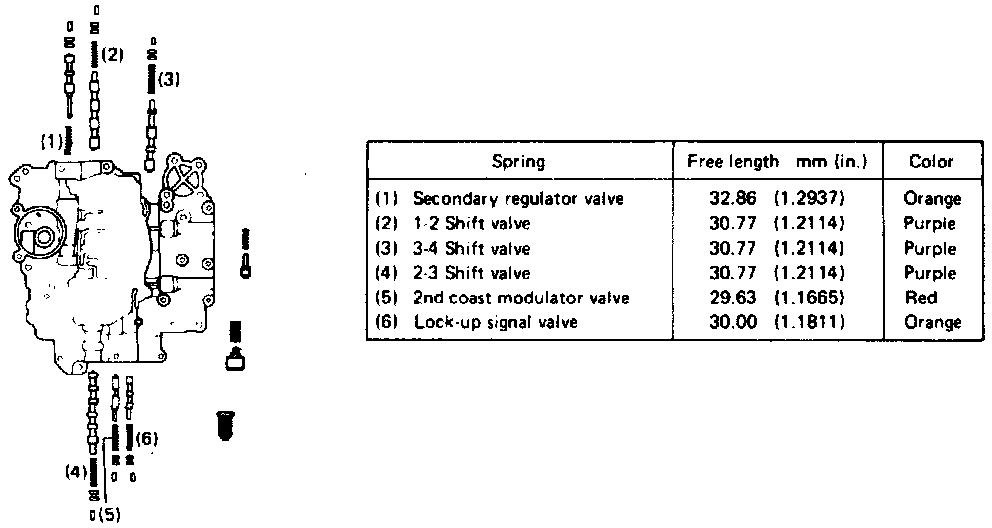9. Check lower valve body valve springs for squareness, rust and collapsed coils. Measure free length of springs and replace if less than specified in image.