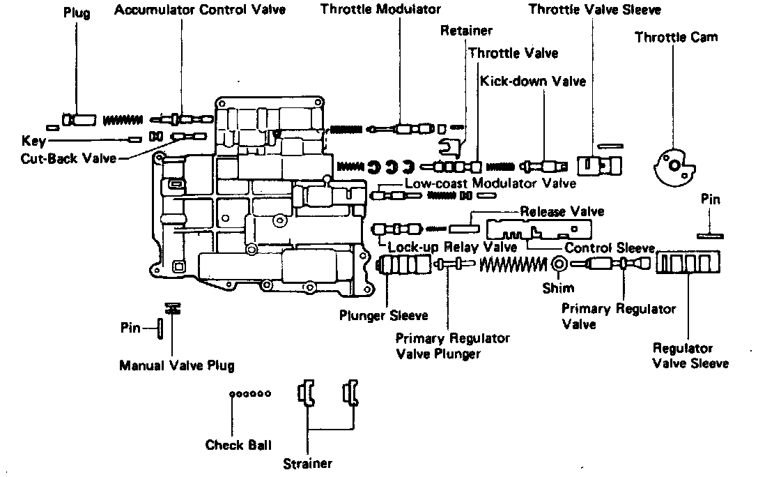 6. Remove throttle valve retaining pin, then the valve sleeve, kick-down valve, throttle valve and spring. Remove spring and adjusting shims from upper side of upper valve body. Note number of shims removed as number of shims changes throttle pressure.