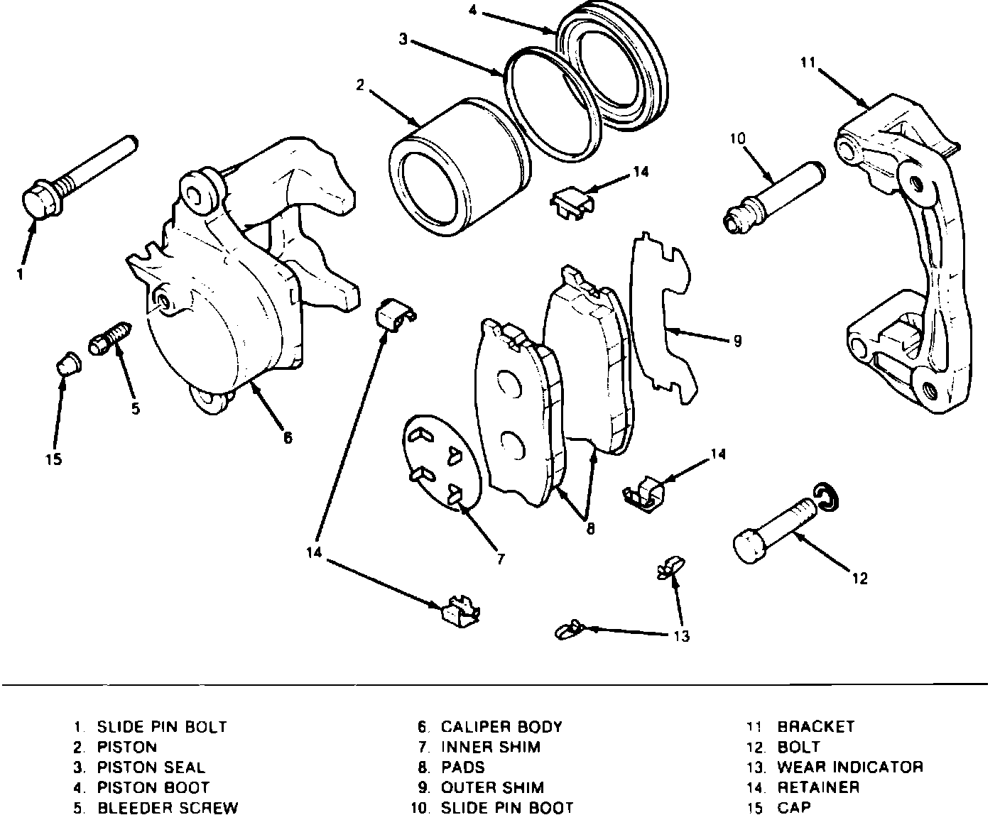 Fig. 2 Exploded view of disc brake caliper assembly. 1987-88 turbocharged models: