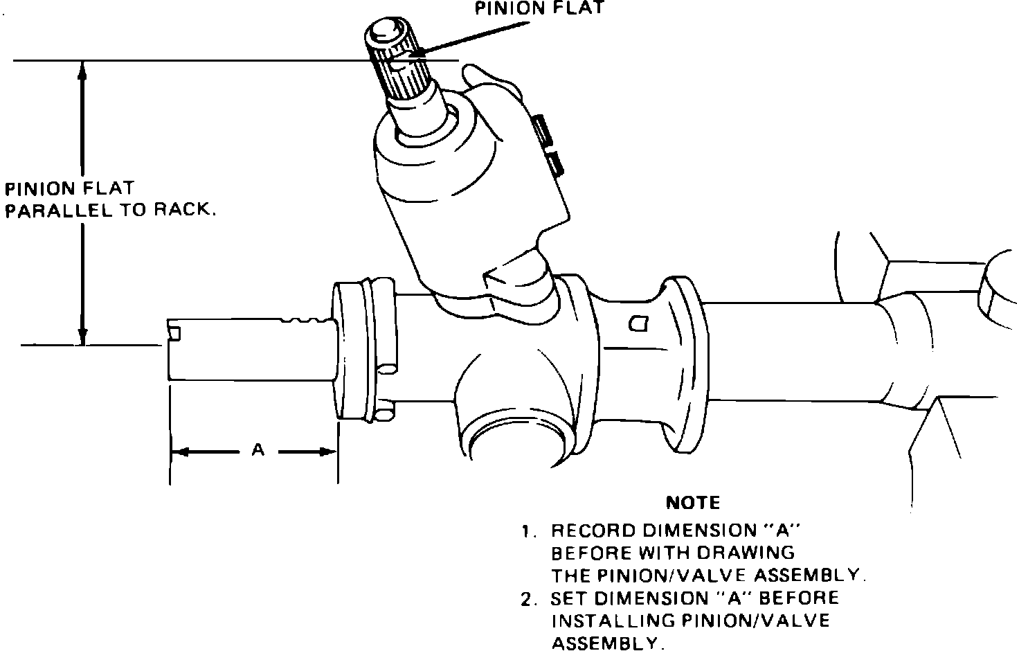 7. Rotate pinion gear until pinion flat is parallel or aligned to the rack assembly. Carefully measure dimension A, Fig. 5. Record reading. This relationship must be used for assembly.