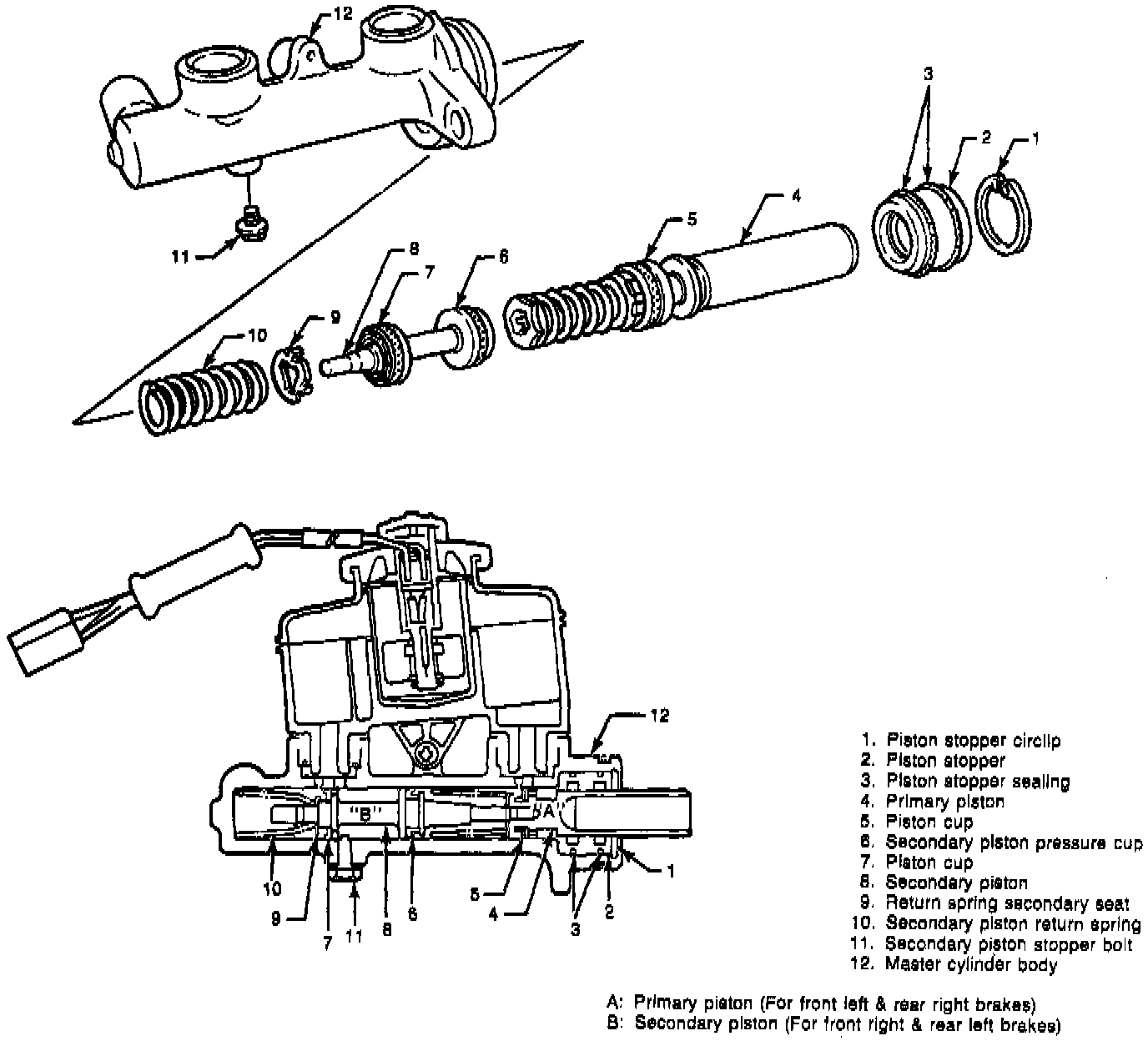 Depressing the brake pedal forces primary piston "A" toward the left (in Figure) to pressurize the fluid immediately ahead for front left & rear right brakes. By this pressure and by the force of return spring, secondary piston "B" moves similarly to pressurize the fluid for front right & rear left brakes.