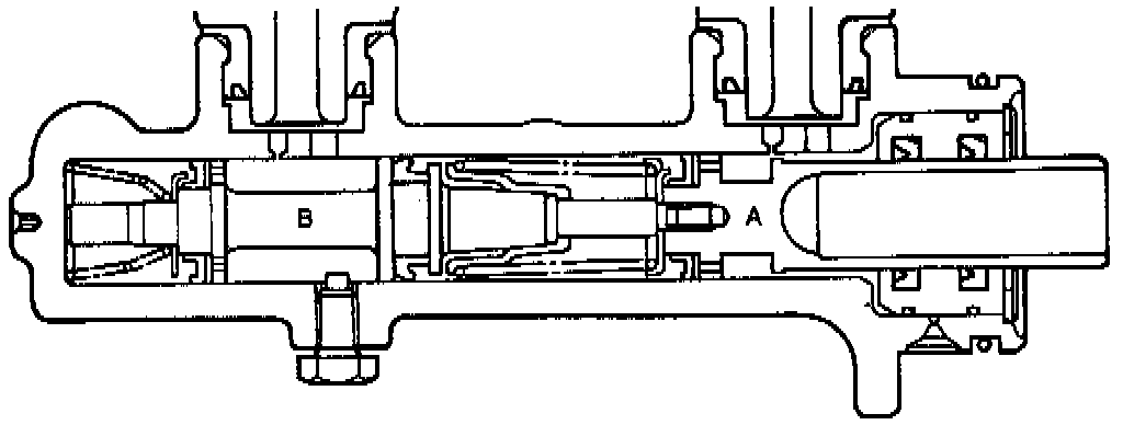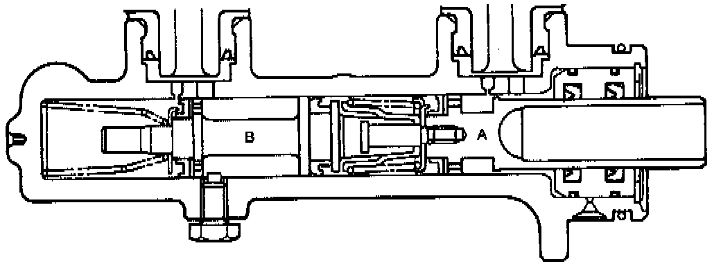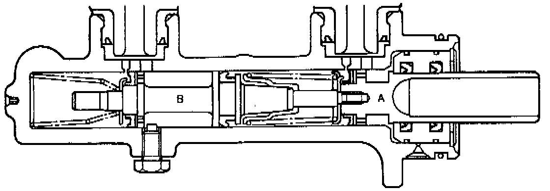 In this case, the leftward movement of piston "A" has but little effect in pressurizing its fluid (for front left & rear right brakes) at first, because the initial rise in fluid pressure causes piston "B" to promptly yield and move toward the left. Very soon the forward end of piston "B" comes to and bears against the head of the cylinder. From this point on, the leftward movement of piston "A" becomes effective to pressurize the fluid ahead of it for the front left & rear right brakes. The below Figure shows secondary piston "B" at halt.