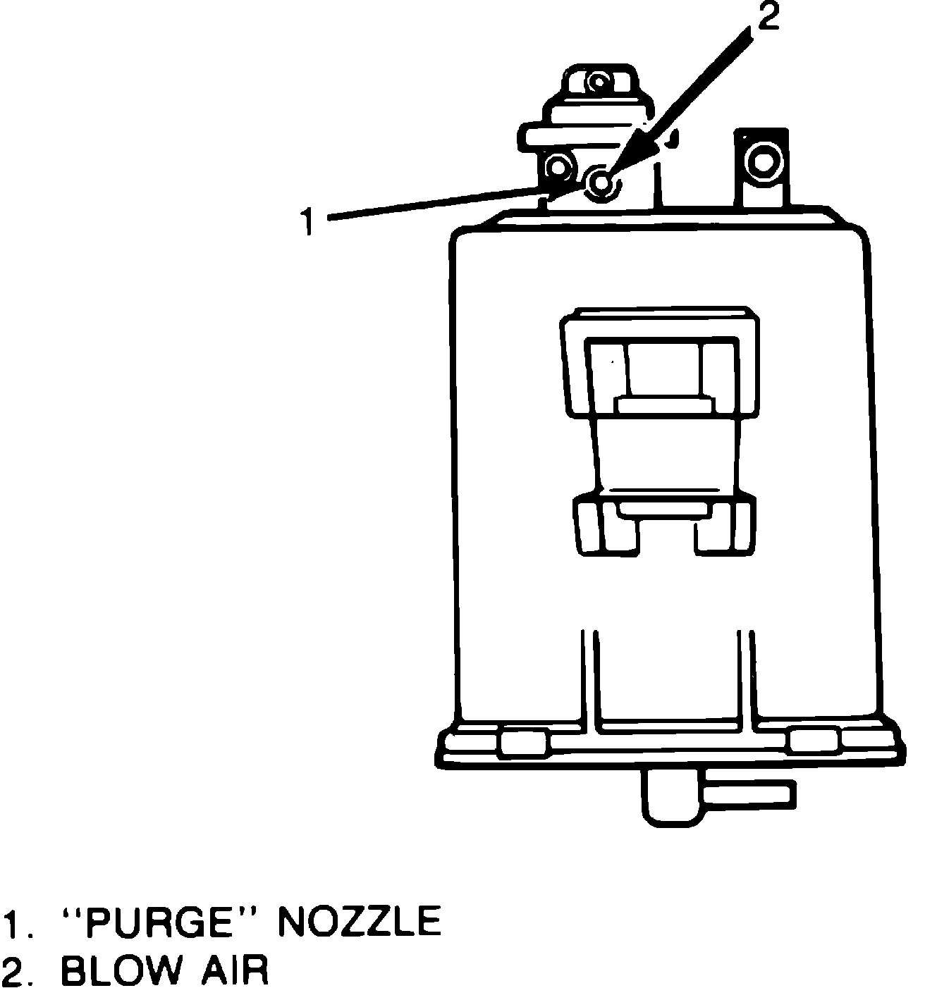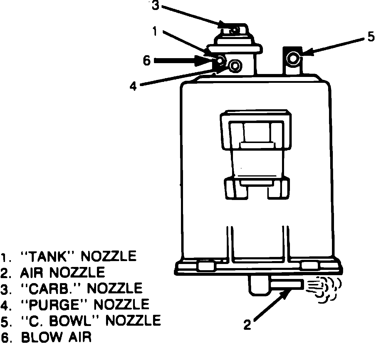 3. Apply a vacuum of at least 3.15 inches Hg (80 mm Hg) to CARB nozzle and blow air into PURGE nozzle. Air should escape from TANK and C. BOWL nozzles and air nozzle at bottom of canister, Fig. 10.