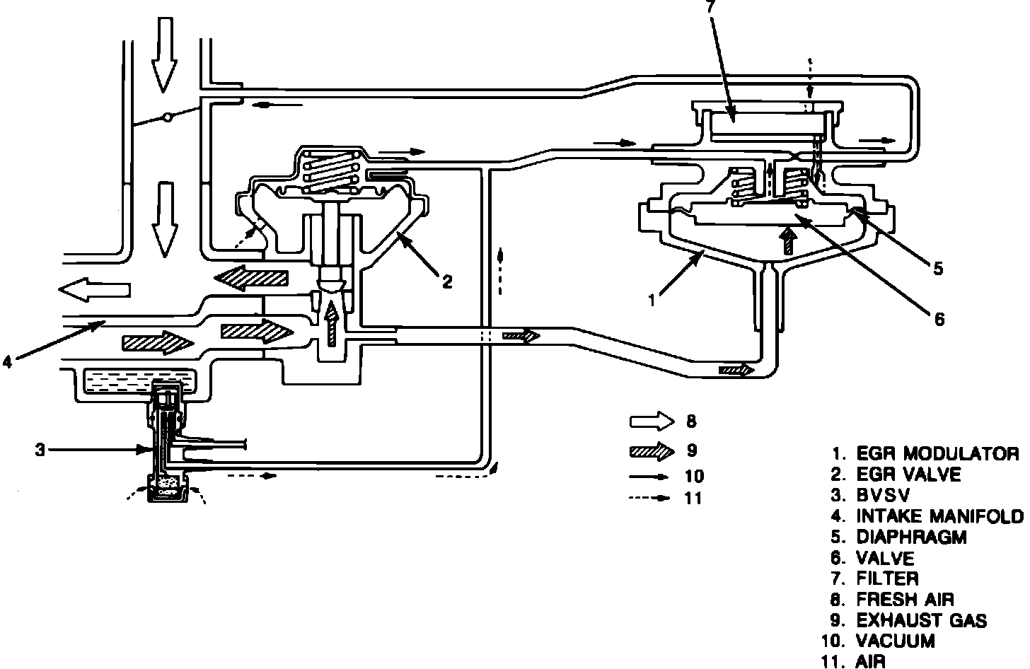 EGR operation is also controlled by coolant temperature. When coolant temperature is low, the Bi-metal Vacuum Switching Valve (BVSV) on the intake manifold opens the EGR valve vacuum passage to the atmosphere, causing the valve to remain closed. Once normal operating temperatures are reached, the BVSV closes and the EGR valve operates according to the EGR modulator.