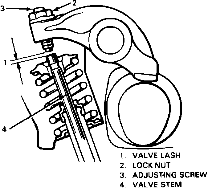 5. Adjust valve lash, if necessary, by turning adjusting screw after loosening locknut, Fig. 4. After adjustment, tighten locknut to specified torque.