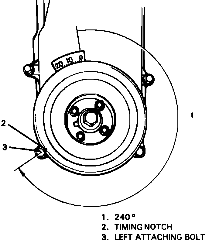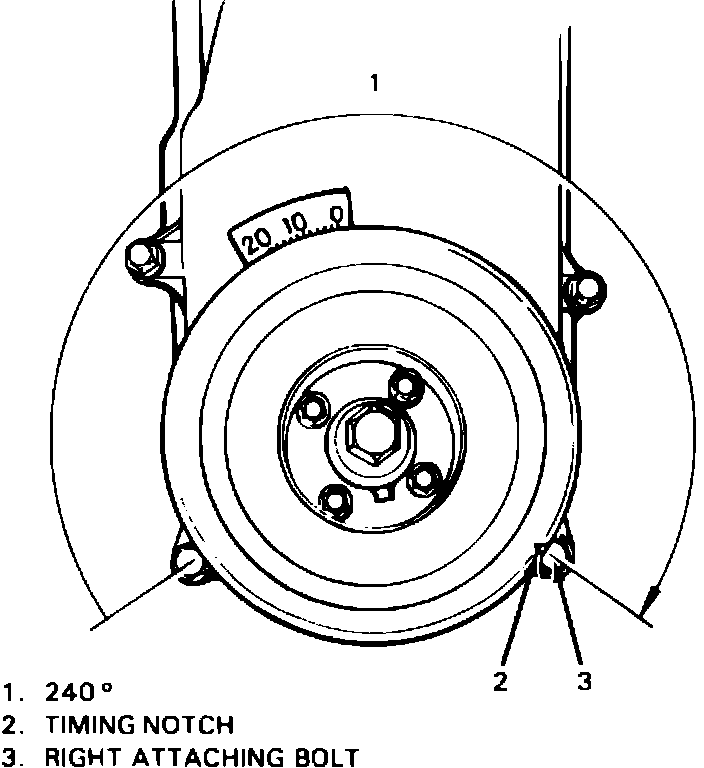 7. Rotate crankshaft 240 degrees clockwise from left mounting bolt, and align timing notch with right mounting bolt as shown in Fig. 6. Then, check and, if necessary, adjust intake and exhaust valves of No. 2 cylinder.
