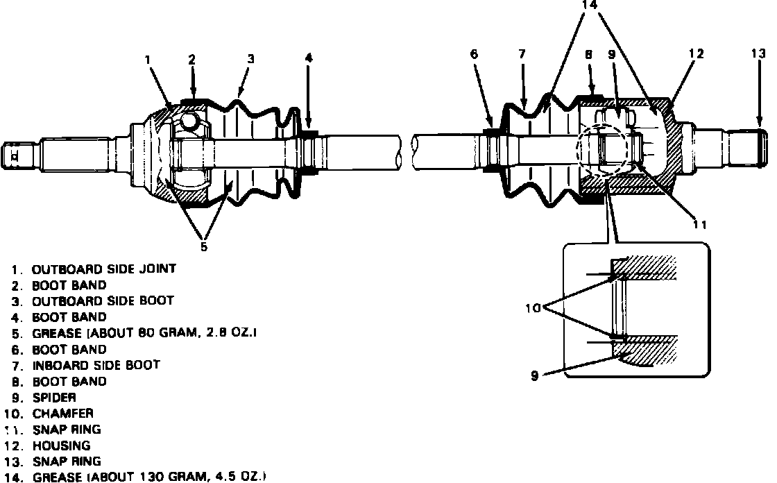 4. Remove inside and outside boots from shaft. Do not disassemble outboard joint. If joint is defective, it must be replaced as an assembly. Do not disassemble inboard joint spider as it is serviced as an assembly.