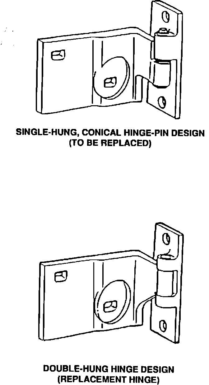 This Special Policy covers the condition described above for ten (10) years and unlimited mileage with no deductible from the date the vehicle was originally placed into service regardless of ownership. Correction at no charge to the customer will consist of replacing all door hinges on involved vehicles which experience failure of any single-hung door hinge. Double-hung design hinges will be used to replace the failed single hung hinges (see illustration).