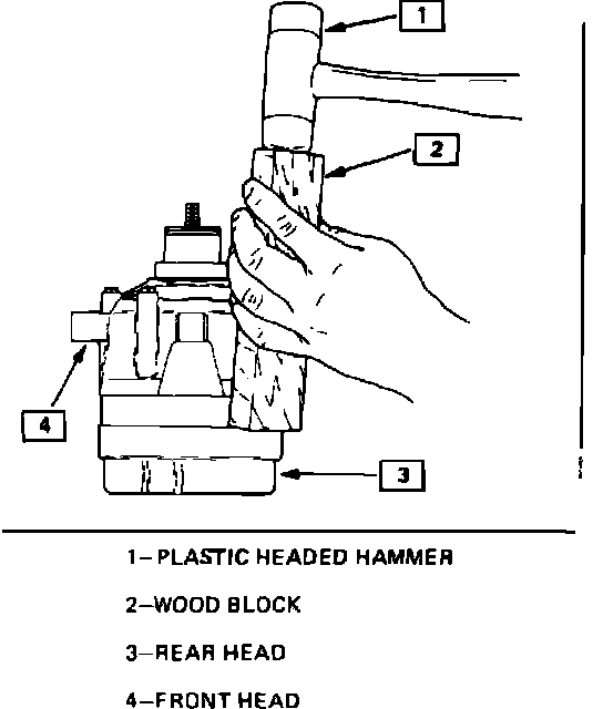 5. Tap around front head at mounting bosses with suitable mallet and wood block, Fig. 7, then disengage front head from cylinder assembly.