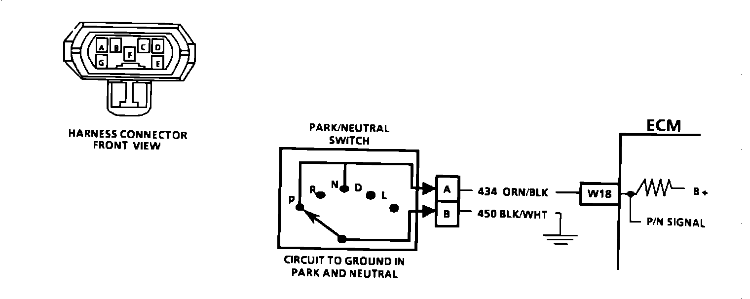 The PARK/NEUTRAL switch contacts are closed to ground in park or neutral and open in drive ranges. The ECM supplies ignition voltage through a current limiting resistor to circuit 434, and senses a closed switch when the voltage on circuit 434 drops to less than one volt. The ECM uses the P/N signal as one of the inputs to control idle air and vehicle speed sensor diagnostics.