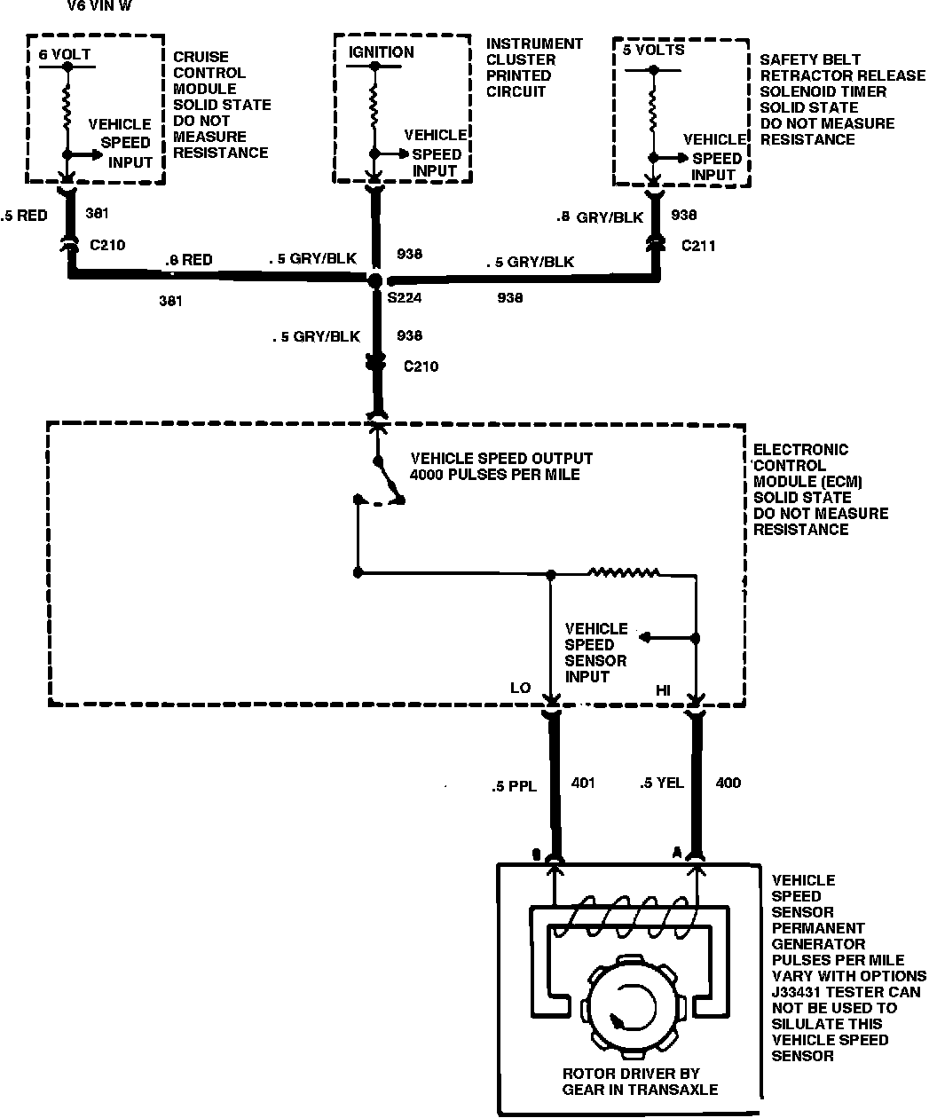 The signal for the speedometer/odometer comes from the VEHICLE SPEED SENSOR (VSS) mounted on the transmission. The VSS creates an AC signal that is sent to the electronic control module (ECM) through two wires (purple and yellow). The ECM processes this VSS signal and creates a new signal based on data stored in the ECM's MEM-CAL (PROM) such as the axle ratio, engine, transmission, etc. The new ECM speed signal is sent to various devices that have to know the vehicle speed to operate properly. These devices include the instrument cluster, speedometer, cruise control module (V6 only), and safety belt retractor release solenoid timer (1989 only).