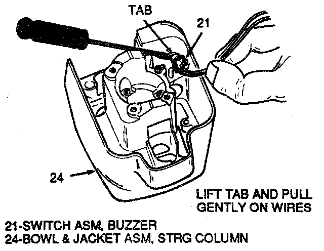 4. Buzzer switch (21). Use screwdriver to lift switch tab and pull gently on wires to remove.