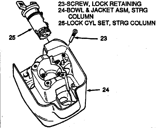 8. Lock retaining screw (23) and torque to 2.5 Nm (27 Lbs. In.). After the screw is in place, turn the lock cylinder to the "Start" position and the rack will extend, also the steering shaft lock bolt can be seen extending and retracting as the lock is turned from start to lock.
