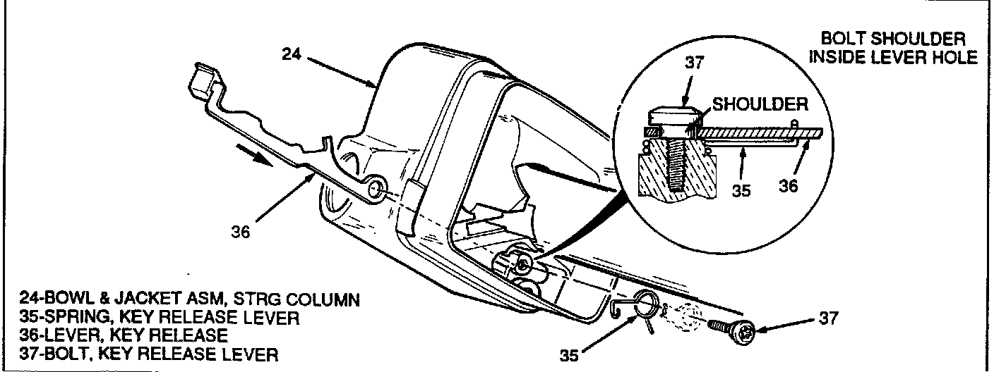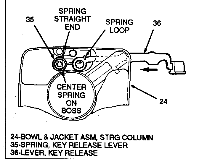 ^ Key release lever (36) through slot in column bowl and jacket assembly (24).