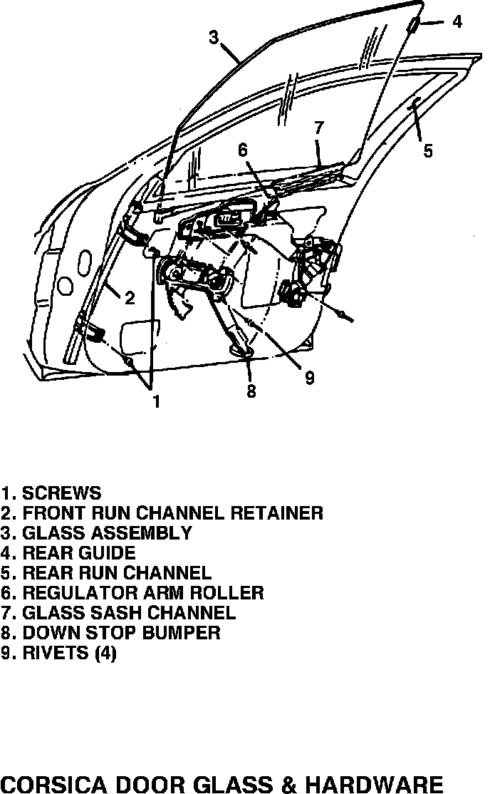 Some 1988-89 Corsica/Beretta vehicles may exhibit front door glass disengagement. This condition may be due to the front glass guides coming out of the lower end of the front run channel retainers and/or the rear guide coming out of the rear run channel on Beretta styles only.