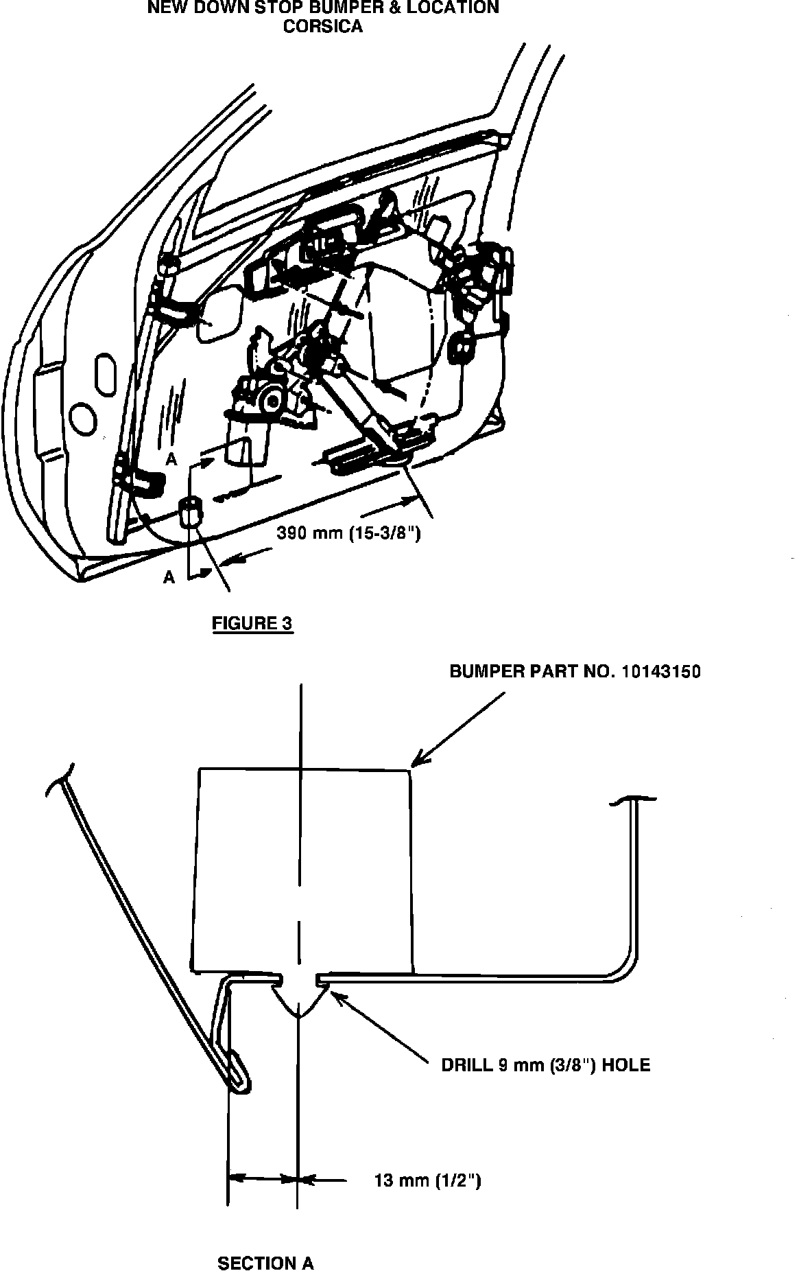 3. Install new (40 mm) down stop bumper by locating and drilling 9 mm hole in bottom of door as shown in Figure 3. Use GM P/N 10143150. After installation, apply a coating of GM# 1052349 Lubriplate, GM# 1052863 Silicone Grease or equivalent to the tops of both down stop bumpers.