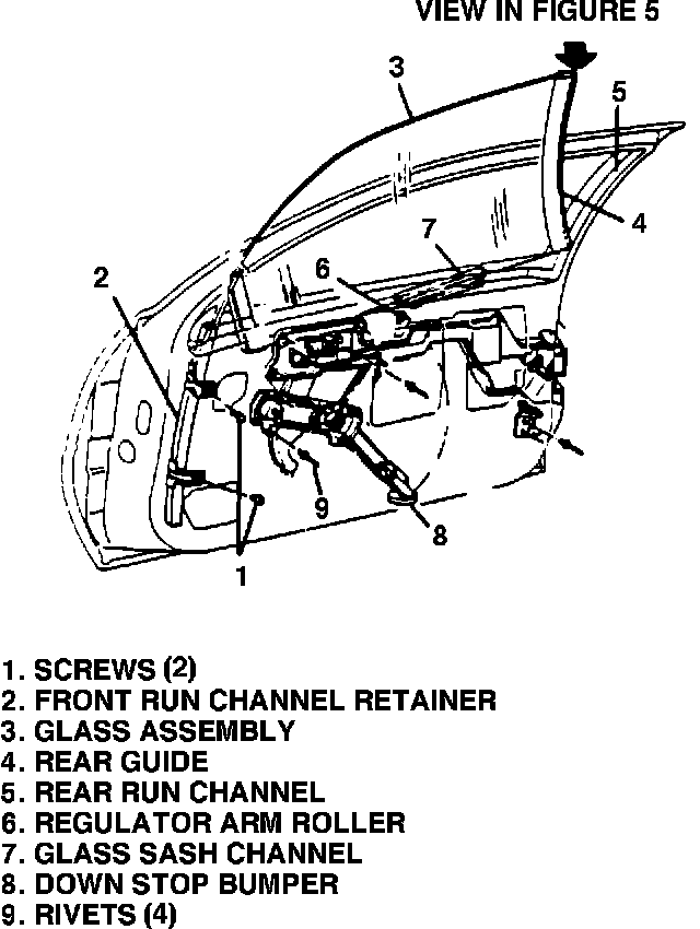 1. Remove door glass and inspect glass guides for damage or wear. If guides show no damage or wear and glass assembly can be reused, inspect rear edge of rear guide and lightly sand rear surface of guide using 400 grit paper until the mold parting line disappears (See Figure 5). If any damage to glass guides are present, replace glass assembly.