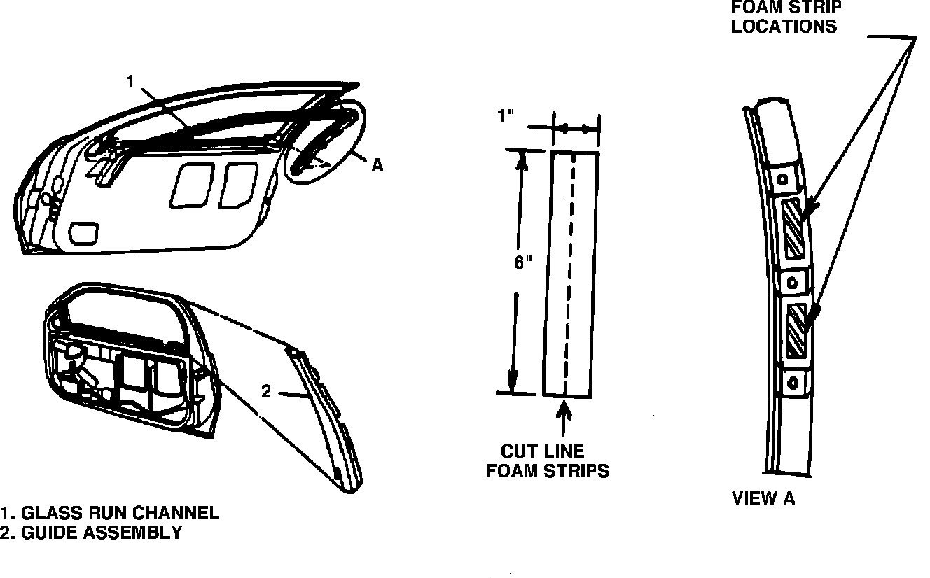 IMPORTANT: IF MOVEMENT IS NOTICED (OR IF RUN CHANNEL HAS TO BE REPLACED DUE TO BENDS OR DISTORTION), INSTALL TWO FOAM STRIPS ON BACK OF RUN CHANNEL AS SHOWN IN FIGURE 7, VIEW A. (MAKE FROM 6" X 1" STRIP OF 3M (R) # 06375 (4508) FOAM TAPE, OR EQUIVALENT, CUT IN TWO PIECES LENGTHWISE). THIS MATERIAL SHOULD PROVIDE THE PROPER AMOUNT OF INTERFERENCE TO PREVENT RUN CHANNEL MOVEMENT. AFTER FOAM INSTALLATION, INSTALL RUN CHANNEL INTO FRAME.